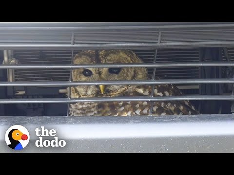 A wild owl was stuck inside the grill of this woman's car, so she called a wildlife rescue to come…