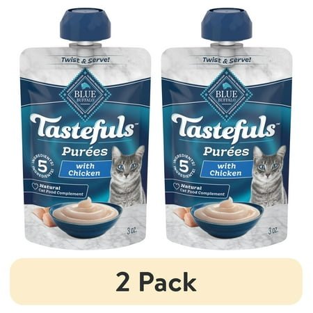 RESEALABLE CAP: Resealable twist-cap for easy portioning without the mess just refrigerate the pouch and serve again later JUST FIVE INGREDIENTS: Made with only five natural ingredients including broth and real chicken to satisfy your cat’s cravings while providing high moisture content to support daily hydration SNACK, TREAT, OR TOPPER: Serve as a snack or treat between meals or use as a topper with your cat’s favorite BLUE Tastefuls dry and wet foods to make mealtime even more special NATURAL CAT FOOD: BLUE Tastefuls contains NO poultry by-product meals, NO corn, soy, or wheat a common thickening agent used by many other brands Contains one Three oz Resealable Twist Cap Pouch of BLUE Tastefuls Adult Cat Natural Purées ENHANCED IMAGERY: We have enhanced our digital product packaging to highlight our products ingredients and essential benefits. While the physical packaging will differ slightly, all information is accurate.