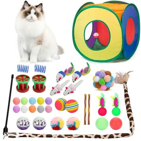 33 PCS Cat Toys Value Set:The best kitten toys assortment:1 x rainbow cat tunnel, 1 x rainbow fuzzy ball, 1 x cat feather teaser wand, 2 x jingle bell balls, 2 x rainbow balls, 2 x sponge feather balls, 2 x column bell toys, 2 x quiet balls, 2 x plush toys, 2 x cat spring tubes, 2 x cat springs, 4 x colorful mouse, 10 x pom balls,bring a lot of fun for your kittens! Enhanced Indoor Cat Play Tunnel: Our newest rainbow cat tunnel tube comes with 6 different color on each size to attract the pets’interest,and a bell ball is hang in the cat tunnel exit for interactive playing, Two holes are designed on both sides of the tunnel to improve air circulation.interactive cat toys ideal for cats to play on their own. Pet Safe & Durable: These best cat toy kit is made from durable and non toxic natural materials, safe for your cats to bat, chase, roll and carry around,cat toys balls 100% safe for your pets and family.To ensure your pet’s safety, replace any damaged toys in a timely manner! Easy to use & Collapsible:Collapsible cat tunnel is Made of tear proof material and a memory steel skeleton,can be easily folded or opened within seconds, ensuring simple storage. Cat Toy Bundles Ideal Gifts: A fantastic gift for pets on birthdays, Thanksgiving, Christmas, or other holidays, suitable for cats and every cat lover.