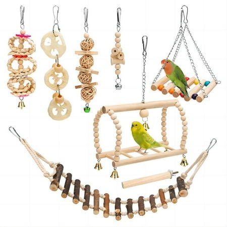 8 pieces of bird toys for parakeets and other small to medium-sized birds Toys are arranged in multiple layers to provide opportunities for climbing, chewing, and exploration Offer exercise and enrichment for your birds to chew, climb, and swing Safe for birds to chew on, made of durable materials Suitable for most small and medium-sized birds, such as parrots and parakeets Easy to install in almost any bird cage with the included active hook Provides hours of fun and entertainment for your feathered friends every day