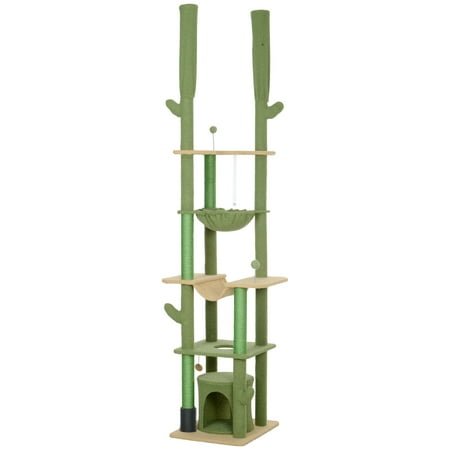 Elevate your cat’s playtime with the SSLZ floor-to-ceiling cat tree. This tall cat tree adjusts from 88.6″ to 100.4″ to fit snugly in any space. Featuring a cat condo, two cozy cat hammocks, and a soft velvet finish, it’s the purr-fect activity center. Stable and space-saving, it includes a cat tower with scratching posts to keep claws busy and furniture safe. Features: – Adjustable height from 88.6″ to 100.4″ – It includes two cat hammocks and a cave, promoting restful lounging – Soft velvet covering – Ceiling-reaching posts and a stable base prevent tipping – Anti-tipping kit included for additional safety and stability – Posts designed for scratching and grooming, protect your furniture – A dangling ball and two spring balls for play – Designed for two cats up to 11 lbs. each – Assembly required Specification: – Color: Green, Brown – Materials: Particleboard, Polyester, Sisal – Overall Dimensions: 23.6″ W x 18.9″ D x 88.6″ – 100.4″ H – Cat Condo: Dia. 13.2″ x 12.2″ H – Platform Size: 18.9″ W x 18.9″ D, 9.4″ W x 18.9″ D – Scratching Post: Dia. 2.6″ – Post with Grooming Brush: Dia. 3.9″ x 5.9″ H – Hammock: Dia. 13.8″ x 3.9″ H, 18.1″ W x 7.5″ D x 5.1″ H – Base: 23.6″ L x 18.9″ W – Maximum Load: 22 lbs. – Item Label: D30-855V00GN Package Includes: – 1 x Floor-to-Ceiling Cat Tree – 1 x Manual