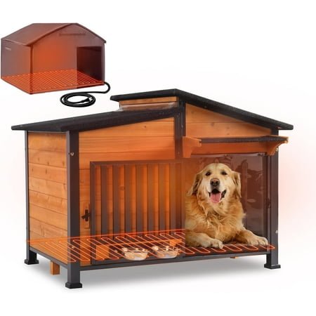 MULTI-LAYER INSULATION & HEATING SYSTEM: Featuring a 6-sided all-around insulated liner and high-quality heating pad, Aivituvin heated dog house locks in cozy temperatures—keeping outdoor dogs warm even when temps drop below 0°C (32°F). The heating pad is UL-tested with automatic temperature control (89–116°F/32–47°C) and a built-in high-temperature protection device, preventing overheating or chilling. It’s also encased in a waterproof enclosure, with a 6.5 ft chew-resistant metal-reinforced cord for extra safety, delivering reliable warmth through rain, snow, or ice ANTI-CHEWING METAL FRAME DESIGN: Aivituvin outdoor dog house is built with a solid wood structure plus an upgraded metal frame—specifically designed to resist chewing and destruction. It stands up to your pup’s natural chewing instincts, so you won’t have to worry about them damaging their shelter. The durable metal reinforcement adds long-lasting protection, keeping the dog house intact even for active outdoor dogs DURABLE WEATHERPROOF PROTECTION: Crafted from solid wood, this dog house withstands extreme weather, accidental impacts, and long-term outdoor use. It has an asphalt roof, waterproof plastic foot pads, leak-resistant elevated base, and slanted roof—all working together to block rain, snow, humidity, and rain pooling IDEAL FOR DOGS + 360° ROTATABLE BOWLS: Measuring 39.7″W x 32.2″H, this dog house has a spacious interior perfect for small to large-sized dogs (up to 40 lbs., shoulder height 15–20 inches). It also includes two spill-proof bowls that rotate 360° freely—with a lock to secure them at the best feeding angle, letting your furry friend eat and drink happily without mess. Built as a practical shelter for dogs, its cozy, roomy design meets both their living and feeding needs EASY CLEANING & ASSEMBLY: the dog house has an openable roof for easy access to the interior (great for quick daily tidying) and a removable bottom plate that can be taken out for deep cleaning, keeping the space fresh and hygienic. All necessary parts are included for assembly, with pre-drilled holes that let you set it up in under 45 minutes. Once assembled, the sturdy structure resists splitting or loosening, ensuring stable use for years