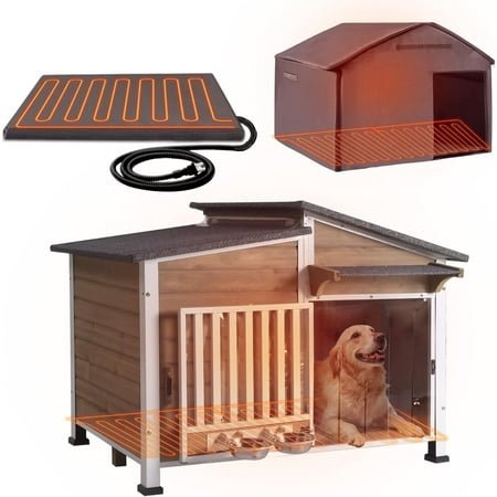 MULTI-FUNCTIONAL PET WARMING HOUSE: Provide a warm and comfortable home for your dog. This dog warming house is equipped with an efficient heating pad to ensure continuous warmth for your dog during the cold winter months. Suitable for both indoor and outdoor use, it offers an ideal shelter for your dog. ALL-AROUND INSULATION DESIGN: The dog house features multiple layers of insulating materials, including waterproof Oxford cloth, waterproof PVC, non-woven fabric, low-pressure heating wire, and 0.78-inch insulating sponge, ensuring that the dog house remains warm under various weather conditions. This comprehensive insulation design allows your dog to enjoy a cozy environment even in the coldest winter days. SAFE AND DURABLE STRUCTURE: The dog shelter is constructed with a sturdy frame and solid fir wood, ensuring stability and durability. The heating pad is designed to be removable and machine washable, making it easy to clean and maintain. Additionally, the heating pad features an anti-bite tube design, enhancing safety for dogs during use. 360° ROTATING DOG BOWLS: The dog house comes with 360° rotating dog bowls, facilitating feeding for dogs both inside and outside the house. This design not only adds convenience for pets but also makes the dog house more versatile and practical. EASY ASSEMBLY AND CLEANING: The dog house is designed for easy assembly, requiring no complex tools or steps. Moreover, the materials of the dog house are easy to clean, allowing you to maintain cleanliness with ease. Both assembly and routine maintenance are designed to save you time and effort.