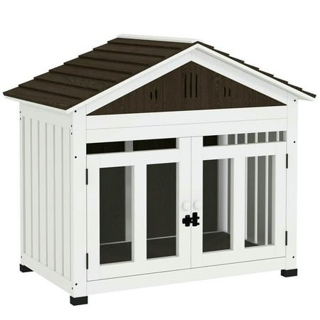 Transform your pet’s space with the Big Dog House! Designed like a cozy house with classic solid wood, this dog kennel furniture blends seamlessly into your home decor. It features a magnetic door with a lock for security and side fences for ventilation, ensuring comfort and style in one. Plus, the removable floor simplifies cleaning, making pet care a breeze! Color: Dark Brown, White Material: Fir Wood, Pine Wood, Acrylic Overall Dimensions: 40.2″ W x 26.8″ D x 36″ H Main House: 37″ W x 22.8″ D x 33.5″ H (Total), 35.4″ W x 21.3″ D x 31.1″ H (Inner) Front Door: 16.5″ W x 20.5″ H (Each) Front Acrylic Sheet: 5.3″ W x 14.8″ H (Each) Feet Height: 1.2″ Bar Spacing: 0.9″ Item Weight: 47 pounds Maximum Load: 66 lbs. Package Includes: 1 x Dog Crate 1 x Manual Barara King Dog House,Pet House,40″L Wooden Dog House Outdoor Indoor, with Air Vents & Elevated Removable Floor