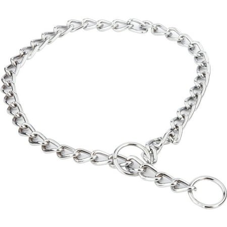 Dog choke chain collar that is chrome-plated for durability. Designed for effective dog training. Prong collar puts even pressure around the neck, but it does not apply direct pressure to the trachea,