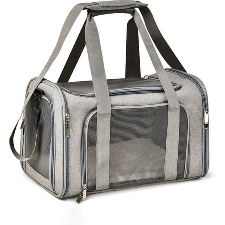 Airline-Approved Design This pet carrier provides two connecting loop handles for balanced carrying as a dual seat belt or luggage strap to secure transport. Breathable Mesh Entrances The three-side entrance on sides, front and top will not only provide fresher air and wider view for your pet, but also easy to take care of your pet. Side Pocket The side pocket is convenient to store treats, toys, food and other travel accessories. Padded Shoulder Strap This cat carrier is easy to carry and store, which has a padded shoulder strap and handles. 3-Layer Cozy Mat Composed of woolen mat, foam layer and wooden board Deluxe Zippers Ensure the safety of your pet inside the carrier Safety Leash Secure your pet to make sure it is safe on the way Sturdy ABS Hooks Support more weight and keep your pet safe WASHING NOTES Promptly wipe up any matter or liquid with a damp cloth or sponge. NOT machine washable PRODUCT DETAILS 1.Color Black / Grey / Pink / Blue / Purple / Green 2.Dimension Medium: 17″ x 11″ x 11″ Large: 20″ x 13″ x 13″