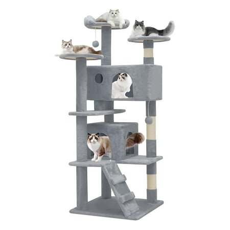 Introducing our Cat Tree, the perfect cat tower with a scratching post and a climbing tower designed specifically for indoor cats. Elevate your feline friend’s living space with this versatile and engaging cat tree, providing them with endless hours of entertainment and relaxation. Our cat tree features a multi-level design that includes spacious rooms and entertaining platforms. Your cat will have plenty of opportunities for rest, exploration, and play, all in one convenient structure. From lounging on the platforms to hiding away in the cozy rooms, this cat tree offers a variety of experiences tailored to your cat’s needs. We prioritize your cat’s comfort, which is why each platform and condo is covered with soft and plush fabric. Your cat will feel like they’re curling up on a cloud as they enjoy the luxurious textures and cozy spaces provided by our cat tree. Ensure your cat’s ultimate relaxation with this comfortable and inviting design. The robust construction of our cat tree ensures durability and stability. The sturdy posts are wrapped with sisal rope, serving a dual purpose. Not only do they maintain the overall stability of the tree, but they also provide an ideal scratching surface for your cat. Encourage well-being scratching habits as your cat sharpens their claws on the sisal rope, keeping them away from your furniture.It comes with dangling balls that stimulate your cat’s hunting instincts. Watch as they pounce, bat, and chase the toys, providing endless entertainment and mental stimulation. Foster a fun and playful experience for your furry companion with our thoughtfully designed cat tree. The spacious cat condo offers a private and cozy retreat for your cat to curl up and relax. Whether they seek solitude or simply want a comfortable spot to nap, the cat condo provides the perfect sanctuary for their needs.