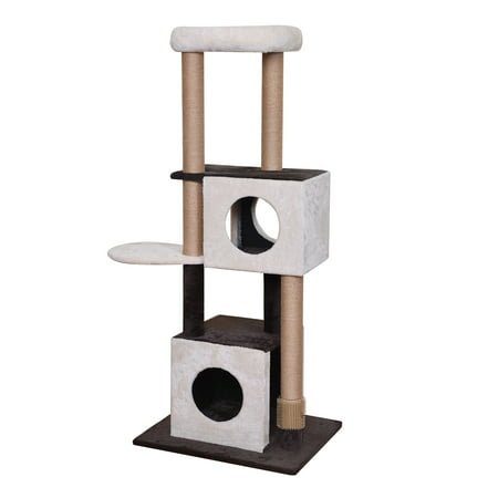 Catry 5-level large cat tree with 2 condos and plush perches. This 55-inch Catry cat tree and cat tower with two condos and two plush perches is the perfect choice for large cats! This cat scratch post cat tower is a heavy-duty construction. This cat furniture is made with superior quality, highly durable materials, a combination of paper scratching post, MDF bottom board and plush fabric. This cat tower is incredibly reliable and guaranteed to last! This tall cat tree provides endless entertaining possibilities. This Catry 5 individual levels cat tower comes with multiple resting plush perches, lounging area and scratching places. These tall double cat condos and two plush perches being suitable for sleeping, daytime naps, playtime, and other activities! This cat plush perch with two condos has convenient scratching posts that help your cat consume energy and keep them entertained for hours at a time. It could avoid the temptation of scratching your expensive carpets, furniture, couch, or drapes! Feline combines elements of the classic and modern cat tower playhouse that nicely compliments any home decor. The cat house is easy to assemble on your own. Dimensions of this cat furniture is 24″ x 20″ x 55″ Buy from Walmart, receive free cat teaser for bonus.