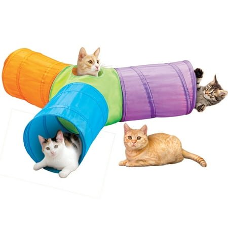 Your favorite felines will love playing in this 3-way tunnel toy The tunnels feature dangling toys and the green section in the center has an opening where inside, your cat can peek out The openings at the ends of the tunnels are 10″diameter Pop-up tunnel folds flat for storage Polyester; imported; 36″L x 32″W x 10″H when open.