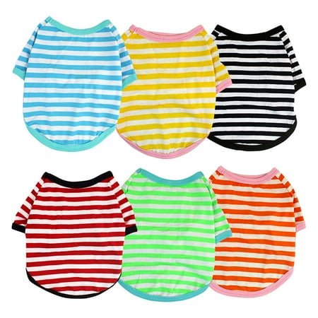 6 Pieces dog shirts striped dog t-shirts pet stretchy pet apparel puppy short sleeves shirts cat tank Suitable for large, medium and small dogs Cute Stripe Tank dogs puppy Outfit, must be getting a lot attention on the street. Easy to put on and take off: Slightly elasticity make it more easier to put on this shirt into your pet. Measure your dog from the base of the neck to the base of the tail for back length. Wide usages: Great for Pomeranian, Yorkie, Papillon, Maltese, Teddy Puppies in summer when in walking, jogging, hunting and other outdoor activities. Specifications: Material: polyester Size: as shown in pictures Color: red stripes, black stripes, red stripes, yellow stripes, green stripes, orange stripes. Package includes: 6 x Dog shirts Note: Manual measurement, please allow slight errors on size. The colors may exist a slight difference due to different screens.