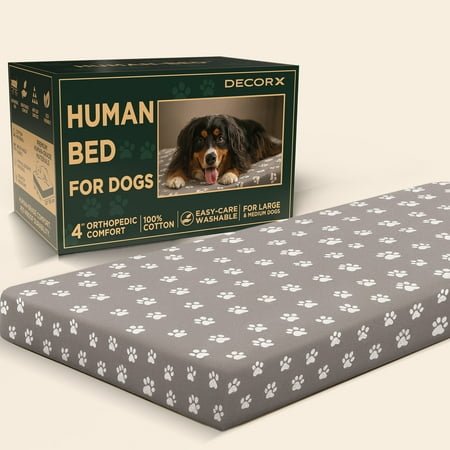 DecorX Human Dog Bed: A Real Bed for Real Dogs Dogs deserve better than sleeping on shaggy polyester or flat, uncomfortable mattresses on the floor. That’s why we created the HumanBed for dogs , a premium sleeping solution that mimics a human bed’s comfort and quality. Designed with love and care for medium-to-large breeds, this innovative bed ensures your dog enjoys the same restful sleep you do. Why Choose the Human Dog Bed? • Elevated Sleeping: Keeps your dog off the ground for better airflow, reduced allergens, and joint support. • Orthopedic Support: Thick, high-density foam provides ultimate comfort for dogs of all ages, especially those with joint or mobility issues. • Breathable Cotton Bedding: Our fitted sheet is made of 100% cotton – hypoallergenic, hair-repellent, and machine washable for effortless cleaning. • Easy to Clean: Simply remove the bedding and throw it in the wash with your own linens. The frame’s raised design also allows you to clean the floor underneath with ease. • Perfect for Your Bedroom: Keep your dog close without compromising your own comfort. A Peaceful Solution for You and Your Pet No more waking up to your dog sneaking into your bed at night! With DecorX Human Dog Bed, your furry friend gets their own sleeping zone while staying close to you. A better night’s sleep for your dog means a better night’s sleep for you.