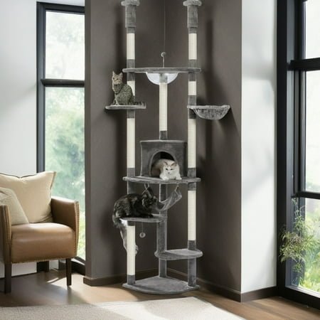 A small number of cats may not like to be close to or adapt to the cat tree when they first come into contact with it. After half a month to a month of adaptation, they will like it. If the height of the product you buy is not suitable, you can contact us, we can put forward the appropriate solution according to your ceiling height. This cat tree tower is fit for celling height 94.5”-102.4”. Please confirm the roof height you want to set before purchasing. The climbing tower with thick posts that reaches the ceiling stimulates the curiosity of cats, allowing your cat to climb trees as much as it likes, perfect for those who relieving lack of exercise and stress! If your cat gets tired, it can relax on the jump plate. It can also be used by multiple cats. The sturdy jump plate can withstand a weight of 30lb. The posts of the cat tower are made of paper tubes. The whole body of the posts are wrapped in strong sisal rope. Cats can easily sharpen their claws. Cats won’t scratch pillars, walls, curtains. Sisal rope is durable, long-lasting, dust-free and clean. The floor-to-ceiling cat tower that does not require drilling holes in the ceiling that is very easy to assemble! It is very space-saving that you can place it in a place such as a wall or a corner of a fence.