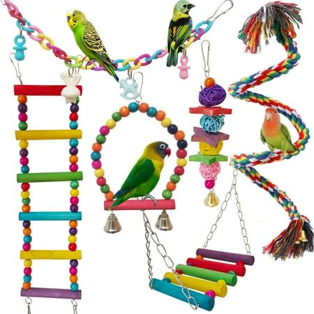 Package Included: The bird sports toys include 6 PCS parrot toys, meets most bird’s needs. Suitable for parrots swing, standing, climbing, playing, chewing, resting and more Useful: These parakeet toys meet birds’ natural needs to have fun and do exercise Suit for Various of Birds: suit for small parakeets, cockatiels, conures, love birds, mynahs, finches, pineapples Safe and sturdy: All made of natural wood, that dyed with edible color. They are handmade, sturdy and bite-resistant Bright Color: Colorful bird swings can easily draw the attention of your pet parrots, attract them to climb and explore