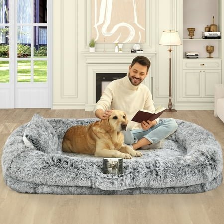 Luxurious Comfort & Warmth: Indulge in the opulence of this human dog bed, featuring premium long-fur PV velvet fabric for a soft and cozy touch. The included pillow and blanket provide added warmth and protection against the cold, ensuring comfort for both you and your beloved pet. Sturdy Support & Ample Space: With a 28D egg cotton filling and a thickness of up to 10cm, this dog bed is built to withstand weights of up to 500 pounds. The 190T anti-slip bottom prevents sliding, while the generous dimensions of 200X110X35.6CM offer plenty of room for an adult to relax or interact with their dog. Versatile Usage: Conveniently store the dog bed using the additional 5cm woven strap and buckle. The top handle can be pulled up for nap time, and the side handle allows for easy transportation to various spaces such as the office, bedroom, living room, or outdoor areas. Ergonomic Design: The dog bed is thoughtfully designed with ergonomic principles in mind. The raised edges provide excellent support for the neck and head, while the side pockets offer practicality for phone use or reading while lying down. Experience relief from shoulder and neck pain, as well as leg and back discomfort, reducing stress and anxiety. Easy Maintenance: Effortlessly maintain the bed by unzipping and removing the filling. It can be machine washed, but it’s important to avoid high temperatures or drying that may damage the material. We recommend natural air drying. For any inquiries, please feel free to contact us.