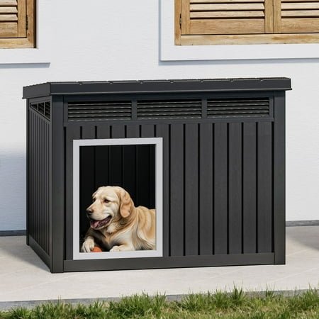 Weather-Resistant Canine Retreat: This plastic dog house keeps your furry friend dry and cozy with a cleverly designed, waterproof sloping roof that effortlessly repels rain, ensuring your pup stays safe, dry, and happy even in inclement weather. Effortless Cleaning with Lift-Up Roof: Say goodbye to awkward scrubbing; the roof lifts smoothly with a strut, making cleanup a breeze. Keep your dog’s space fresh and inviting in just minutes, allowing you to spend more quality time with your furry companion. Durable and Stylish Design: Made from tough polypropylene (PP), this outdoor dog house is both sturdy and sleek. Its chic gray sides, bold black roof, and matching black door frame create a stylish addition to any backyard, complementing your outdoor décor. Optimal Ventilation for Comfort: Louvered vents on the front and upper side panels ensure constant airflow, keeping your pet cool and comfortable, even on warm summer days. Your pup can enjoy a cozy yet well-ventilated space. Convenient Size and Effortless Setup: Measuring 32.2 x 25.1 x 24.1 inches, this dog house is ideal for small to medium-sized dogs. Assembly is quick and easy – just snap the panels together and fasten a few screws, leaving you more time to enjoy playtime with your furry friend.