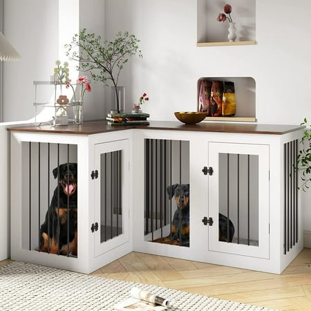 【Multifunctional Large Dog Crate】Not only a dog kennel but also can be used as corner cabinets, TV cabinets, cabinets, display racks, plant cabinets, etc. 【Multi-placement Ways】Two dog crates of different sizes, can be stitched into a variety of placements or flattened the two cages together as a long dog crate table 【Dual-door & Lock Design】Equipped with iron-absorbing stone door suction, which can automatically absorb closes 【Intimate Design】Each cage is equipped with a custom thick and soft cushion to give your pets a warm and comfortable rest space 【Strong & Secure】Matched with a solid iron railing. Compared with mesh-shaped fences, the field of vision is better and stronger 【Simple Assemble】Has a clear and detailed manual. According to the instructions, you can complete the installation within 1 hour