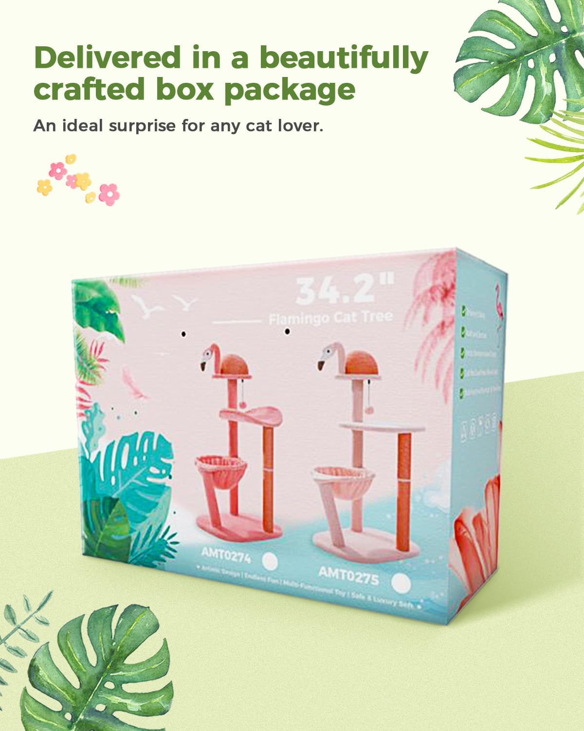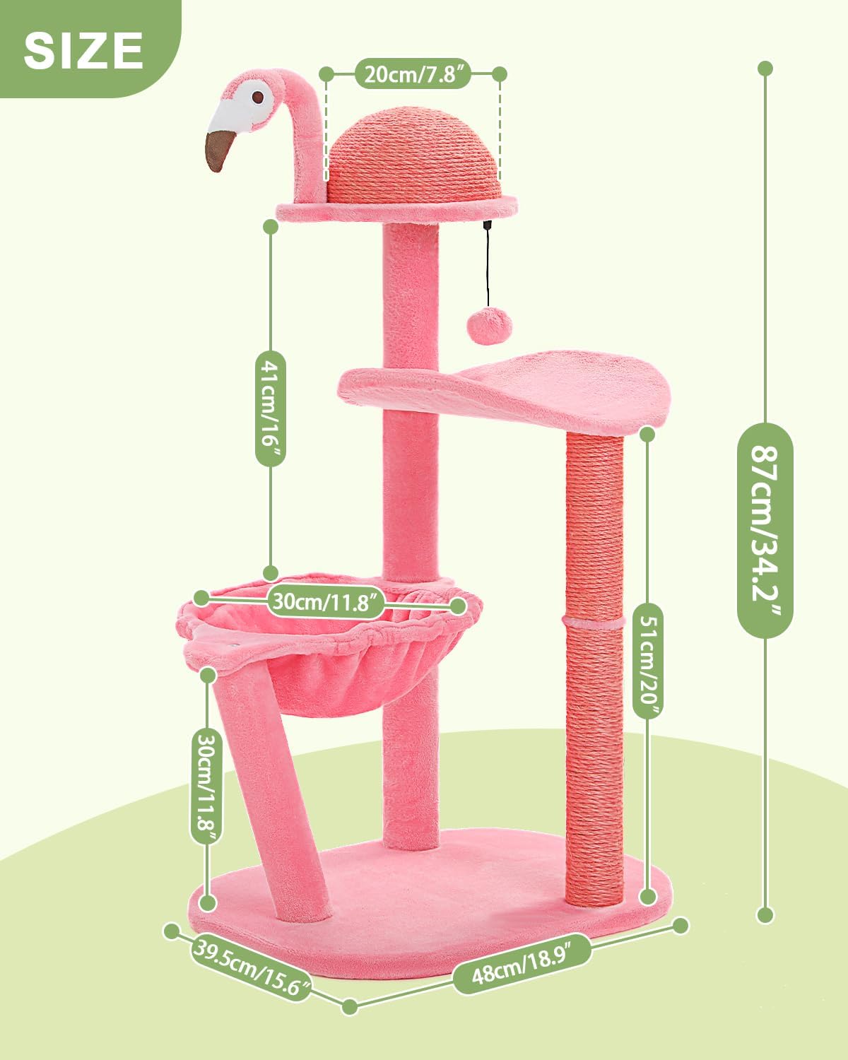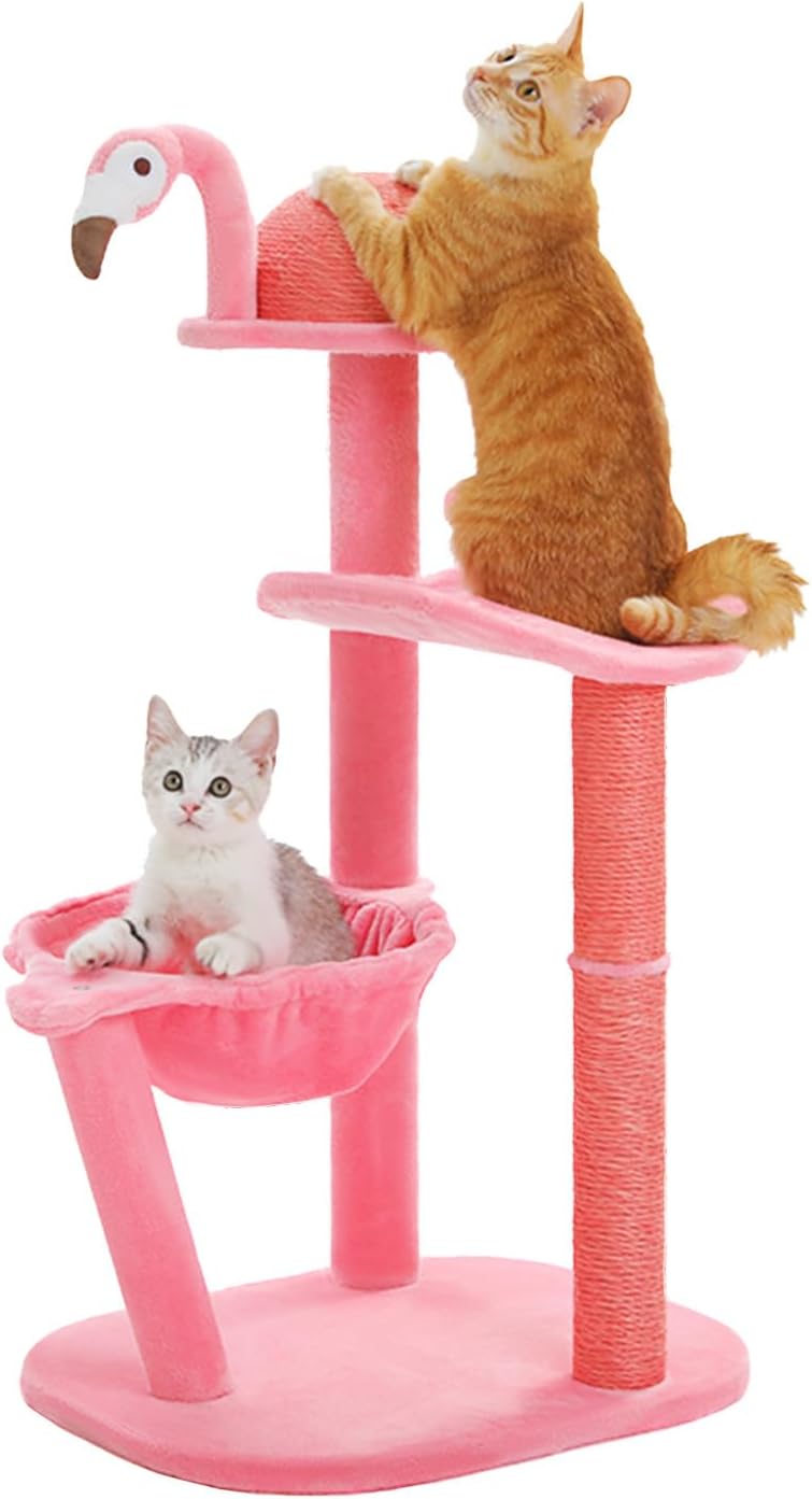 Multi-Level Structure: The 4-tier design cat tree to your cat’s natural climbing instincts, encouraging upward exploration with an artistically designed flamingo plush toy. Equipped with one hammock and one platform, this climber is a favorite spot for felines, especially ideal for small to medium cats, offering enhanced stability and safety.