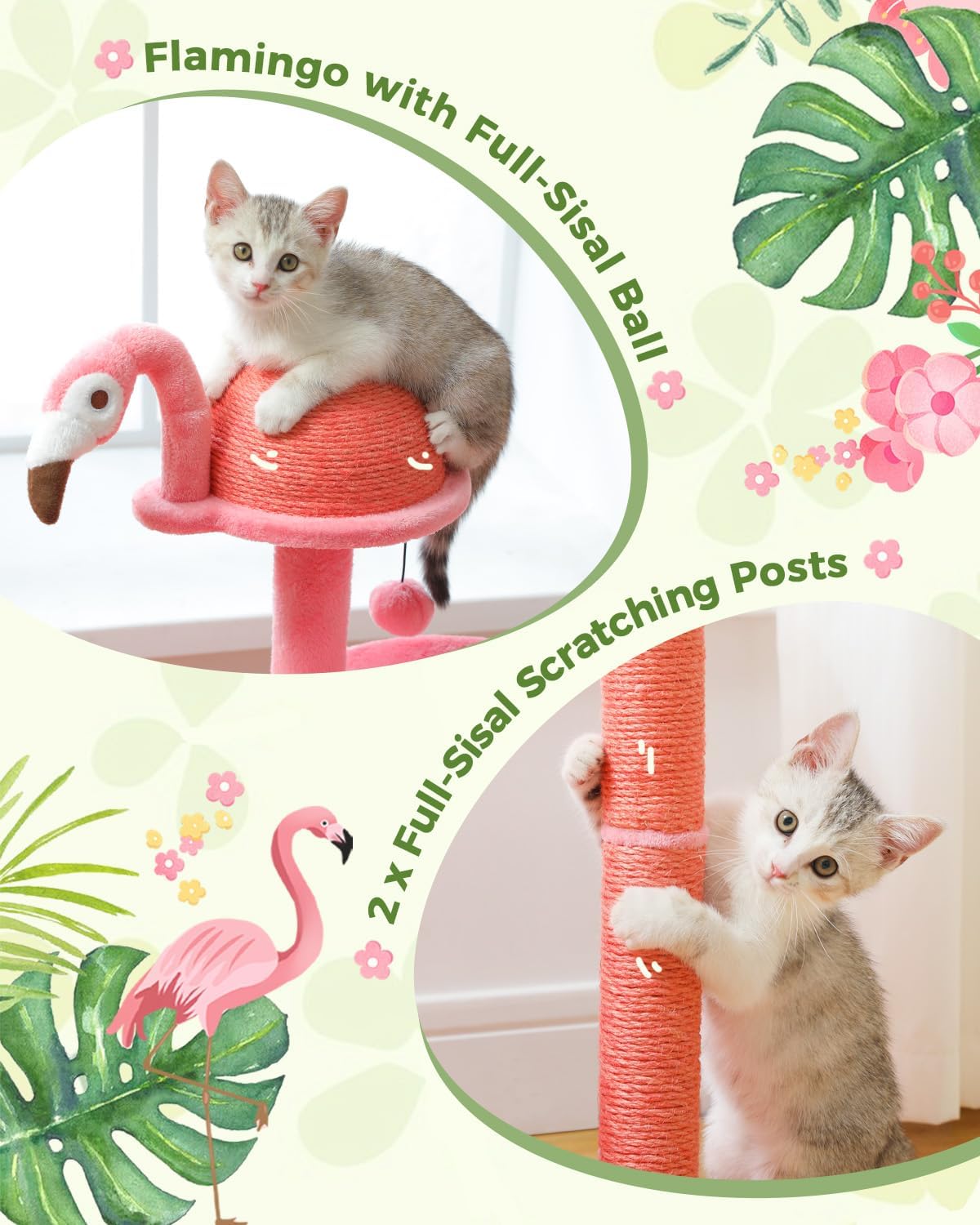 Multifunctional Flamingo Cat Tree: Equipped with 2 pink full-sisal scratching posts and 1 full-sisal ball φ20cm=7.87inch, this flamingo-shaped cat tree meets all your cat’s scratching needs. The 100% natural sisal semi-circular body offers cats a comfortable scratching posture and a satisfying scratch experience.