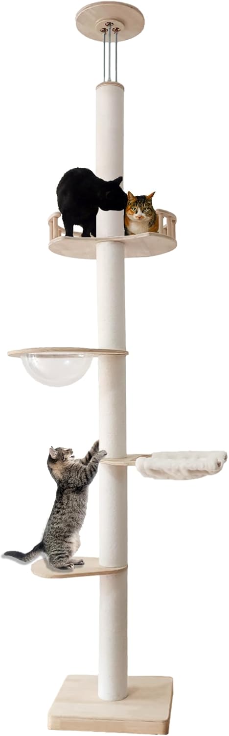 SPACE SAVING & ADJUSTABLE HEIGHT: This floor to ceiling cat tree with the bottom base measuring 23.5×15.8” that occupying minimum space while providing maximum vertical space. It is constructed with different height of post to allow it to match the ceiling height up to 112”. (If your room is over 112 inches high, contact us and we will offer you more size columns)