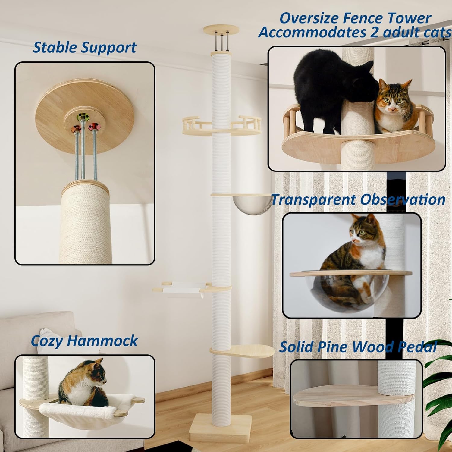 We have five matching cat trees available.Cat tree with four different levels: Including cat nest, springboard, hammock, space capsule, and fence lookout.Outfitted with two brief poles. Height Adjustable 90.5″ to 114.5″.No Need to Drill Holes on the Ceiling, spring top to make the cat tree more stable.