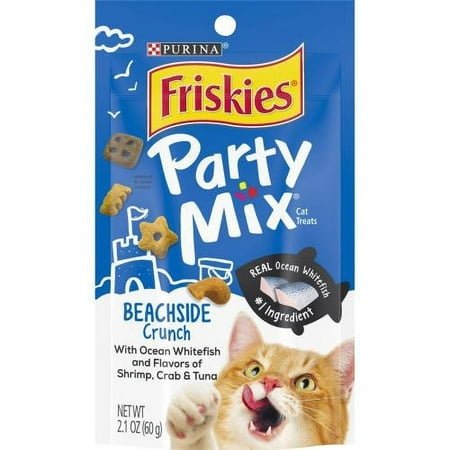 Make treat time an ocean of fun for your cat when you give her Purina Friskies Party Mix Beachside Crunch adult cat treats. Real ocean whitefish is the #1 ingredient in this mouthwatering recipe, and every bite delivers shrimp, crab and tuna flavors for the irresistible seafood taste cats love. Each serving features a crunchy, satisfying texture that also helps keep her teeth clean.