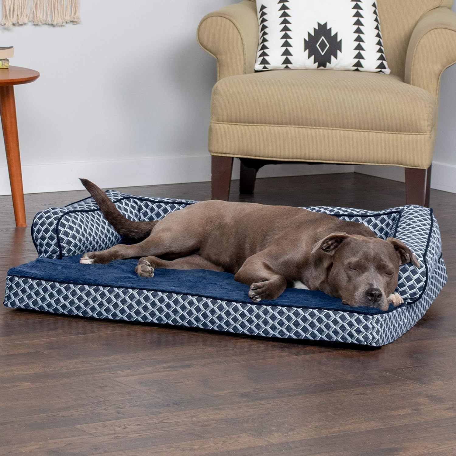 COMFORT AS PRIORITY: The sofa-style design creates a cozy and inviting space that promotes comfort and security; designed with supportive bolsters for dogs to rest their heads on for optimum lounging comfort