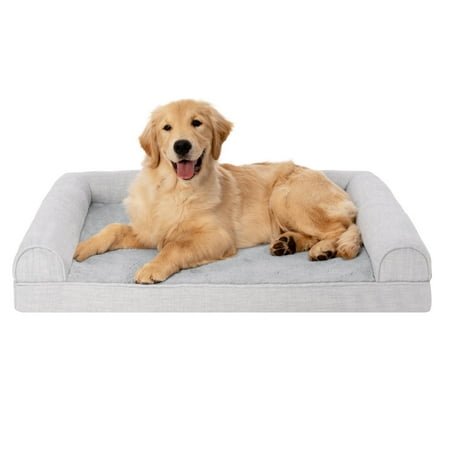 COMFORT AS PRIORITY: The sofa-style design creates a cozy and inviting space that promotes comfort and security; designed with supportive bolsters for dogs to rest their heads on for optimum lounging comfort SLEEP SURFACE: Featuring a cuddly soft plush faux fur main sleep surface and bolsters wrapped in durable woven performance linen; both are gentle on noses and paws for enhanced snuggling and burrowing comfort EASY ON JOINTS: The egg crate orthopedic foam base helps cushion pressure points and improve air circulation, while fluff-filled bolsters support the neck, back, hips, and joints; helps ease discomfort and promote restful sleep CUSTOMER ASSURANCE: Comes with a 90-Day Limited Coverage against material defects and may also qualify for our 60-Day Worry-Free Program; restrictions apply: purchases from unauthorized 3rd party resellers may not be covered by Furhaven PRODUCT DETAILS: Orthopedic Dog Bed, Mist Gray; Large – 36″ x 27″ x 6.5″ (3″ Base Foam Height; Sleep Surface: Approx. 28″ x 23″) CERTIPUR-US: Our foam is independently tested to meet CertiPUR-US standards for emissions, content, and durability; made WITHOUT formaldehyde, phthalates, mercury, lead, and ozone depleters EASY CARE: The dog bed cover is completely machine washable and is easily removed with a two zipper design that allows access to the foam base and bolsters; for more specific care instructions, please refer to the hang tag and/or seam label