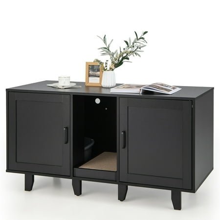 Description: Provide a Comfortable Toileting Experience for Your Lovely Kitten! Our cat litter box enclosure measures 47.5” x 20.5” x 25.5” (L x W x H) and each compartment measures 16” x 20” x 20” (L x W x H), which can accommodate most cat litter boxes (Notice: Please measure the size of your cat litter box before purchase). With the wide tabletop, the cat furniture can also be used as a TV stand that can hold TV screens up to 50”. With 2 individual compartments, this hidden cat washroom is great for safeguarding your cats’ privacy, allowing them to unleash their natural instincts. Cats can also enjoy scratching fun with the medium scratching board. Features: The adjustable foot-pads enhance stability while preventing slipping Can be used as a cat litter box enclosure, side table, TV stand, coffee table, etc The spacious tabletop can be used for putting TVs, decors, cat supplies, etc Specification: Color: Black Material: PB, MDF Overall Dimensions: 47.5” x 20.5” x 25.5” (L x W x H) Size of the Compartment: 16” x 20” x 20” (L x W x H) Weight Capacity of the Tabletop: 44 lbs Weight Capacity of the Interior Board: 88 lbs Net Weight: 59.5 lbs Package Included: 1 x Cat Litter Box Enclosure 1 x User’s Manual