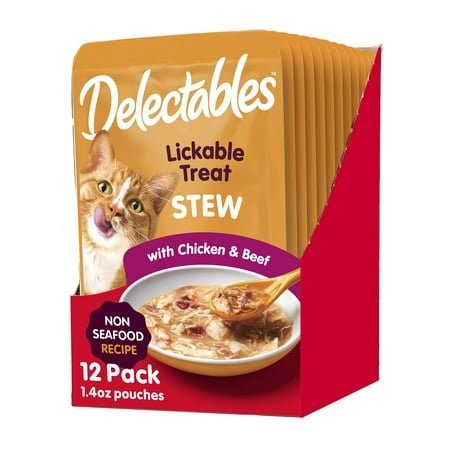 1 PACK: Each Delectables Stew Lickable Treats pack includes 12 – 1.4-ounce pouches. NON-SEAFOOD RECIPE: Made without any seafood, this Stew recipe is made with tender chicken and beef blended into a hearty sauce so delicious your kitty will lick it right up! TASTY WET TEXTURE: The meat and sauce are entangled in this tasty wet texture, ensuring your kitty eats the whole treat, rather than licking up the sauce and leaving the meat behind. MANY WAYS TO USE: This wet treat can be used as a cat food topper, a quick snack, or special treat that even the most finicky eaters will enjoy. TRY MORE TEXTURES & FLAVORS: Delectables Non-Seafood Lickable Treats are available in a Stew & Bisque texture with chicken, chicken & veggies, chicken & beef, chicken & cheese and chicken & duck. 1 PACK: Each Delectables Stew Lickable Treats pack includes 12 – 1.4-ounce pouches. NON-SEAFOOD RECIPE: Made without any seafood, this Stew recipe is made with tender chicken and beef blended into a hearty sauce so delicious your kitty will lick it right up! TASTY WET TEXTURE: The meat and sauce are entangled in this tasty wet texture, ensuring your kitty eats the whole treat, rather than licking up the sauce and leaving the meat behind. MANY WAYS TO USE: This wet treat can be used as a cat food topper, a quick snack, or special treat that even the most finicky eaters will enjoy. TRY MORE TEXTURES & FLAVORS: Delectables Non-Seafood Lickable Treats are available in a Stew & Bisque texture with chicken, chicken & veggies, chicken & beef, chicken & cheese and chicken & duck. 1 PACK: Each Delectables Stew Lickable Treats pack includes 12 – 1.4-ounce pouches. NON-SEAFOOD RECIPE: Made without any seafood, this Stew recipe is made with tender chicken and beef blended into a hearty sauce so delicious your kitty will lick it right up! TASTY WET TEXTURE: The meat and sauce are entangled in this tasty wet texture, ensuring your kitty eats the whole treat, rather than licking up the sauce and leaving the meat behind. MANY WAYS TO USE: This wet treat can be used as a cat food topper, a quick snack, or special treat that even the most finicky eaters will enjoy. TRY MORE TEXTURES & FLAVORS: Delectables Non-Seafood Lickable Treats are available in a Stew & Bisque texture with chicken, chicken & veggies, chicken & beef, chicken & cheese and chicken & duck.
