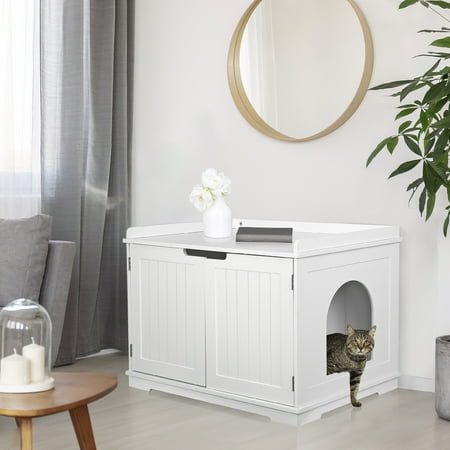 Cat Washroom: Overall Dimensions: 29.8in L x 20in W x 20.5in H . Interior Dimensions: 26.8in L x 18.3in W x 16.5in H .Cat Hole: 9in W x 10.2in H. Designed to provide a private space for your adorable pet while cleverly containing the litter and preventing the odor from spreading into the surrounding. Removable Partition Wall: Has a removable partition wall to form a small and larger cabinet, creating additional space to store litter, scoop, and other kitty supplies. Sturdy and Durable: It has a sturdy wooden structure that would last many years, can bear large weight up to 110lbs. The durable MDF board painted with water based lacquer, is healthy, eco friendly, and has less smell than other cat washrooms. Multi Functional: Cat Litter Box Enclosure is wide usage as a beautiful end table, entrance bench as well as cathouse to hide your cat’s litter box. Wide top space to place a pet bed to create a cozy corner, or organize your kitty gears, magazines, décor, etc. Easy to Assemble and Clean: All necessary hardware and instructions are included. Its magnetic door design is made for easy access and cleaning. Please feel free to contact us for any issue, and we will make you happy again. Specifications: Color: White. Material: MDF and Iron Net Weight: 36.4lbs Weight Capacity: 110lbs Package Includes: 1 x Cat Washroom1 x Accessory Pack1 x Instruction