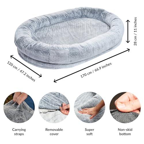 【PORTABLE & EASY TO STORE】The 48 x 72 x 11 inches human dog bed has convenient handles that makes it effortlessly portable. Take it anywhere with you, from the bedroom to the living room, playroom, or study space. It’s your cozy oasis, wherever you go!