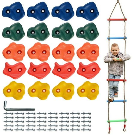 Suitable for indoor or outdoor, make a great addition to the home wall, swing set, playset, jungle gym, rock, or playground equipment. Easy to install, come with instruction. Great for children’s exercise and development, promote kid’s strength, balance flexibility, and endurance while having fun. Specification (climbing holds):. Material: Plastic. Weight : 95 g/ pcs. Color: Red, blue, yellow, green, orange assorted. Material: Galvanized steel. Length: 50 mm / 2 inch. Diameter: 8 mm. Specification: (climbing rope ladder). Product name: Newton rainbow climbing rope ladder. Material: PE. Color: Rainbow. Rainbow climbing ladder load-bearing: about 220 lb. Total length: 6.5 ft. Climbing stick spacing: 13 in. Climbing stick length: 12 in. Application: Indoor, backyard, playground, trees, swing set, jungle gym. Package includes: 20 x pcs textured climbing holds. 40 x pcs 8mm zinc plated bolts and nuts, with 1 x Allen wrench. 1 x rainbow climbing rope ladder.