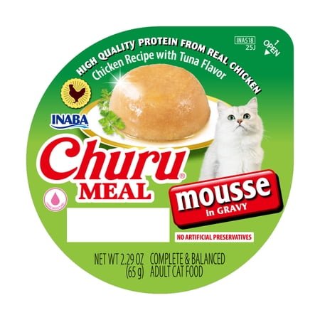 COMPLETE & BALANCED: Our Premium Quality Mousse is a 100% complete & balanced wet cat food for adult cats. From the makers of their favorite cat treats, INABA Churu, you can trust that your cat is getting all the nutrition they need TRUSTWORTHY INGREDIENTS: Churu Meal Mousse is made from real chicken, ground into a soft, smooth blend. Made without grains or preservatives, ensuring that your cat gets only the best, most natural nutrition HIGH IN MOISTURE: Cats get their hydration from their meals, so feeding them a moisture-rich wet cat food, like our Churu Meal Mousse (86%), is key. You can be confident that your cat is getting the hydration they need CONVENIENTLY PACKAGED: Our 2.29 oz no-spill cups are designed for your ease. Simply peel off the top and pour onto a plate/bowl or feed directly from the cup. It’s a simple and fast process, giving you more time to enjoy with your furry friend ADD SOME VARIETY TO THEIR BOWL: Available in six delicious recipes. Try out all of our flavors and find the recipe your cat will love