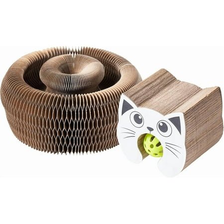 Natural Material:Made of heavy duty corrugated and 100% recycled cardboard,so the cardboard cat scratcher is strong enough to resist the sharpest claws for a fair enough long time.It is also safe and non-toxic.It is does not hurt the claws.Perfectly healthy for your adorable cats. Solve Your Worries:Thoughtful design, wholeheartedly for your cat, to help your cat move, to prevent cats eat too fast, indigestion, become fat and lazy do not love to exercise, so that your cat from now on to say goodbye to laziness! Funny Cat Toys for Indoor Cats:Our litty kurlz comes with a toy ball and a track. Your cat will love tracking and scratching the ball, satisfying their natural scratching instinct. It will help protect your furniture from being damaged. Suitable for cats of all ages! Protect Your Home: The cat scratching board is perfect to fit your cats’ natural scratching need, which will indirectly protect your home furniture like sofa, bed, carpet, etc Foldable & Portable: The kitten toys can be folded as small as a palm, which is very portable and easy for storage. Save your home space when the cats is not playing with it