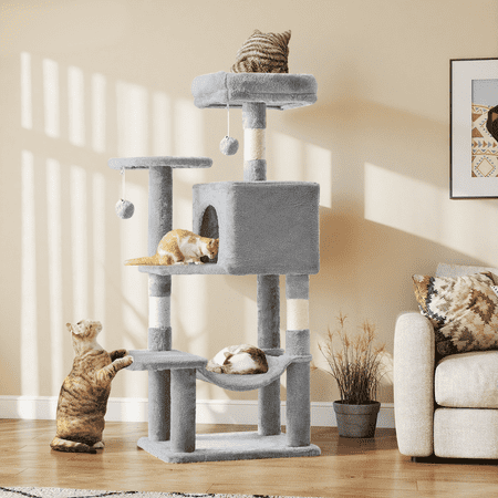 Multi-Level Cat Tree: Multi-zone design caters to feline play needs, specifically crafted for multi-cat households. 44 inch cat tree accommodates 2-3 cats for simultaneous play and relaxation. Features include a cat condo, 2 swinging balls, 2 extended platforms, hammock, and scratching posts, satisfying your cat’s instincts to climb, perch, and hide while delivering endless fun Multifunctional Cat Tower: Indoor Cat tree deeply integrates cats’ natural instincts with furniture protection, combining a cozy cat condo, hammock, dangling balls, and scratching posts. It satisfies cats’ climbing and claw-sharpening needs while reducing furniture damage. Scientifically channeling your pet’s energy, it truly achieves a harmonious coexistence between humans and pets Interactive Multi-Cat Playground: Crafted from premium particleboard and wrapped in plush fabric, this cat tower creates a cozy resting spot. Extended platforms offer climbing and perching areas, while natural sisal rope-wrapped scratching posts provide durable, safe surfaces for claw maintenance. Hanging hammocks invite lazy lounging, enclosed cat nests ensure privacy, and all features keep indoor cats energized