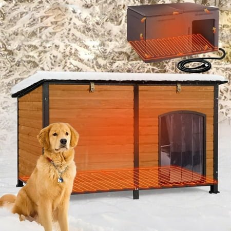 Heated Design: Features a built-in heating system with insulation liner to keep pets warm and cozy during cold winter months Durable Construction: All-around strong iron frame provides stability and lasting durability for outdoor use Spacious Dimension: 59-inch large dog house offers plenty of room for medium to large-sized dogs to move comfortably Weather Protection: Insulated walls and raised floor design helps keep pets dry and sheltered from outdoor elements Easy Access: Features a wide door opening that allows pets to enter and exit freely while maintaining warmth inside