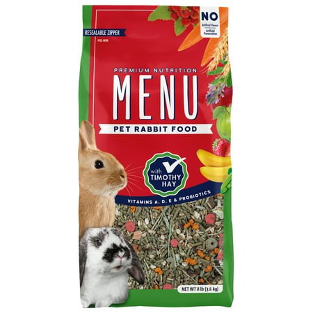 Menu for Rabbits is a new standard for small animal food. With an exciting blend of timothy hay pellets and real fruits and vegetables like carrots, beets, and mountain ash berry, this is the ultimate bunny food for keeping your rabbit happy and satisfied. Pair with healthy sides like sweet baby lettuce and hay for rabbit health.