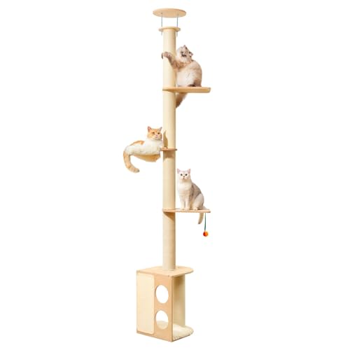 Adjustable Floor to Ceiling Cat Tower: This cat tree maximizes vertical space, making it suitable even for compact areas. Its adjustable design accommodates ceilings up to 108 inches, satisfying cats\’ natural instincts to climb and perch high