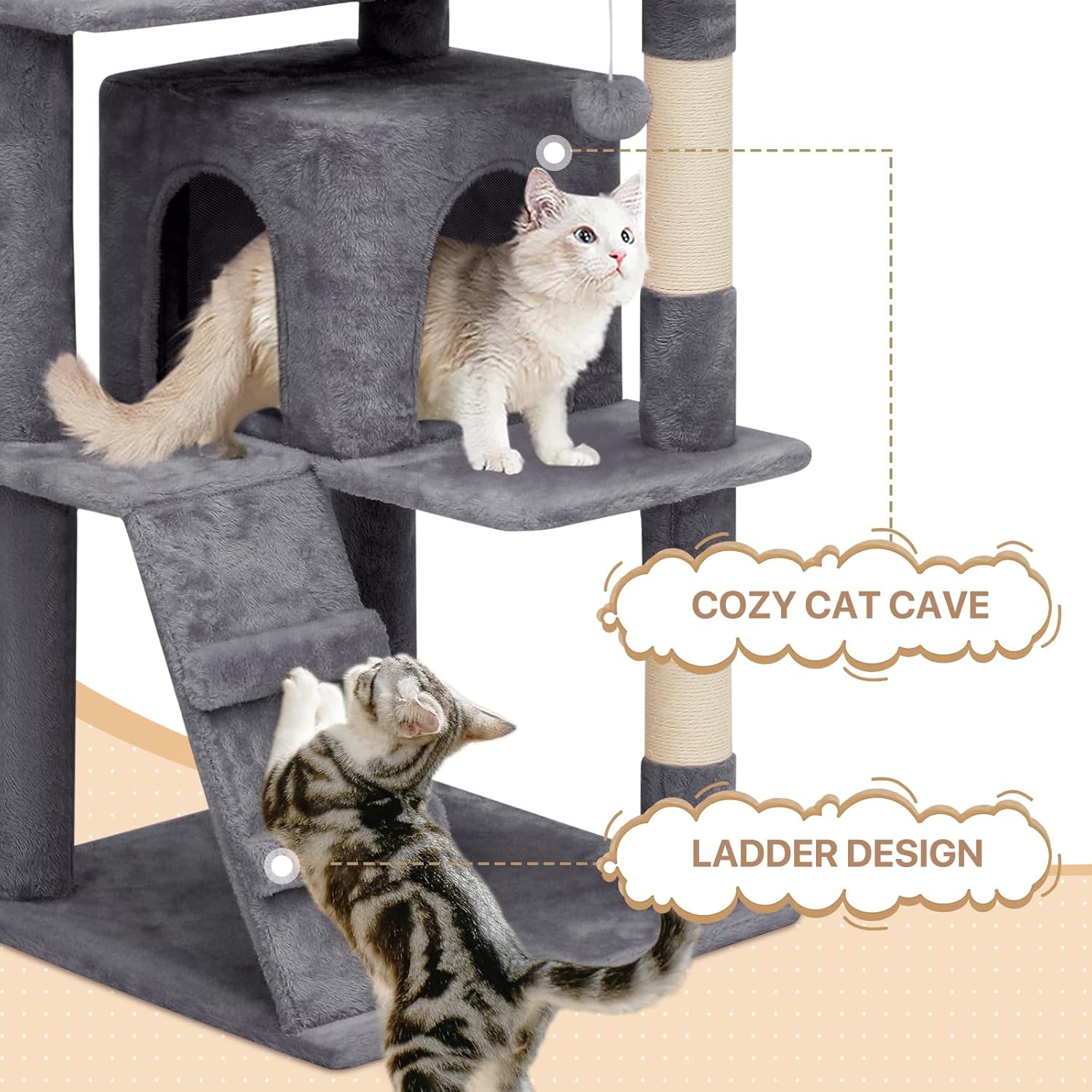 Interactive Accessories – Equipped with hanging toys, this cat tree engages your cat’s instincts to play and hunt, keeping them entertained for hours.
