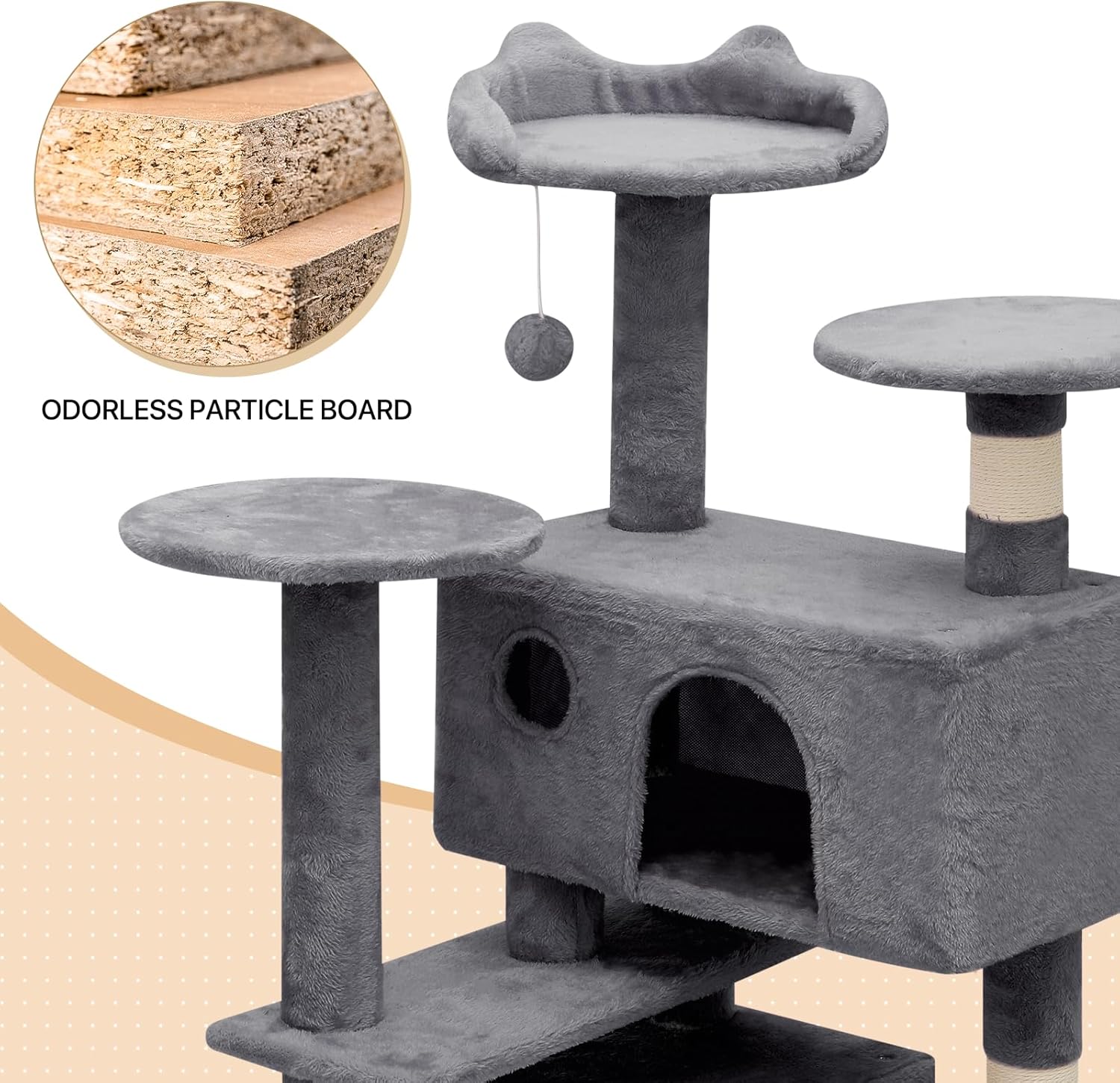 Soft Plush Covering – Each platform and condo is covered in a soft, plush fabric, offering a velvety surface for your cats to comfortably rest and relax.