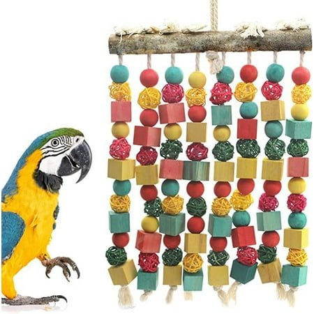 【Upgraded Design,Adjustable Length】MQ Large Bird Parrot Toy has a unique wooden block shape and colorful takraw ball design, and the multi-layer arrangement encourages your parrot to climb and explore; birds also love to untangle cotton knots, which can satisfy their natural urge to chew. 【100% NATURAL PREMIUM MATERIALS】Parrot chew toys are made of natural materials and are completely handcrafted, including 100% cotton rope, 100% natural wood, wood blocks, loofah takraw balls. Make sure to chew it safely. Stronger, bite-resistant and durable materials give your bird an ideal climbing chewing position. 【Large size,Adjustable Length】 The size of Large parrot chewing toy is 11″ X 4.5″X 7″,which provides large spaces for your parrots to climb and chew.The whole length can be adjusted by adjusting the cotton rope on the top, suitable for large African grey parrots, cockatiels and medium-sized parrots. 【Bright and Colorful Design for More Fun】: Our parrot toys have wooden blocks of different shapes and are brightly colored. Colorful colors can delight the spirit of your birds and enhance the joy of life. Wooden blocks of varying shapes, durable ,can be used to condition the birds’ beak and benefit your pet’s health. 【Easy Installation and Easy to Use】: It’s convenient to put the chewing toys in a cage by simply attaching the steel hook to the top of the pet cage. you can hanging it on your cage or on the pole.