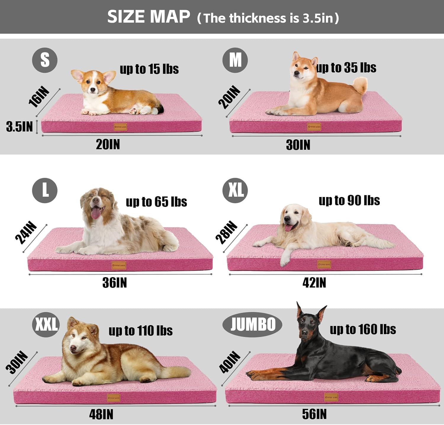 More Choices: There are eight colors available; for each color there are six standard sizes in the range of 20×15 30×20 36×24 42×28 48×30 56×40 inch to choose from; S:20”x15” up to 15 lbs, M:30”x20” up to 35 lbs, L: 36”x24” up to 65 lbs, XL: 42”x28” up to 90 lbs, XXL: 48”x30” up to 110 lbs, Jumbo: 56”x40” up to 160 lbs