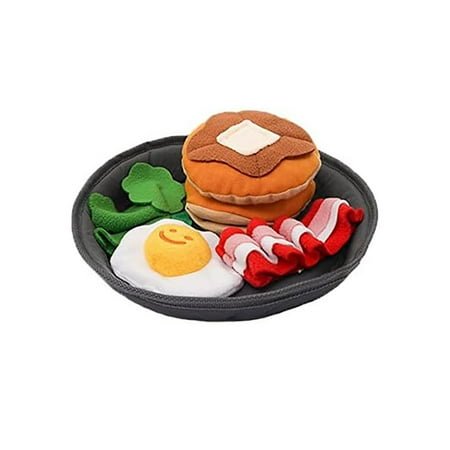 FUN AND INTERACTIVE: This Breakfast platter consists of Sunny Side Up Eggs, Double Stacked Pancakes, Bacon, and Salad. Your furry pet will have a Pawfect time! SQUEAKINESS: There are two squeakers in this set; They are hidden inside the Pancake and the Egg. They have a high-pitched squeak that is irresistible for your furry pet! SAFE AND DURABLE: Made of 100% Polyester. These food items can be separated from the bowl. Not recommended for aggressive chewers TIP: Add dog treats in the bacon and watch your dog love this toy!