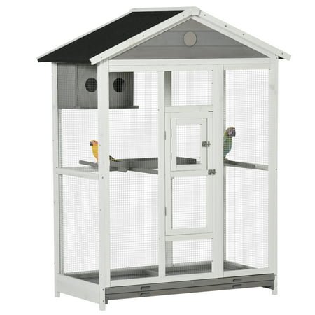 Need your feathered friends together in an enclosed space. The Pawhut bird aviary will help you hold small parrots, finches, budgies, or canaries. The flight cage has two front doors, and each part can be locked to ensure pets are secure and do not escape. You can place this wooden birdcage indoors and outdoors the asphalt roof protects it against light weather elements. Make your birds feel at home with this birdcage from Pawhut.