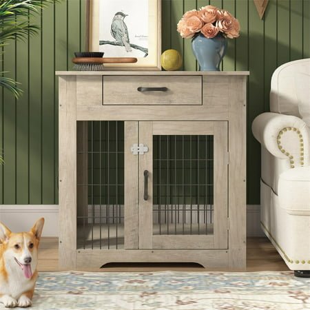 This multi-functional furniture style pet crate serves as a secure space for your furry companion and doubles as a practical side table with storage space for your home. The dog crate classic combo of metal and wood blends seamlessly with existing décor rather than obstructing your interior design. Display household ornaments on the wide flat table-top surface and store your dog walking accessories in the small drawer for added convenience. Dog cage high-quality metal bars enclose the open-air design to allow proper ventilation and 360* degree visibility for your pet. Two interchangeable doors with handles and latch locking mechanisms can be installed on preferred side of pet crate for easy accessibility. The wooden end table helps you by saving space and multiplying as a pet containment and leisure space. Tip to ensuring this crate is the right fit for your pup! • While your dog is standing, measure your dog from the tip of their nose to base of their tail. • While your dog is sitting or standing, measure your dog from the top of their head to the floor. • Add 4 inches to determine maximum measurements. Remember, your dog should be able to stand up and turn around while in their crate. • Exterior Measurements: 29.92”w x 24.80”d x 30.71”h • Interior Measurements:28’’w x 21.65’’d x 21.85’’h • Metal bars are water and rust resistant • Top Weight Capacity: 150lbs. • Bottom Weight Capacity:150lbs. • Indoor use only • Bed not included • Best suited for small-medium sized dogs up to 50lbs. Pieces Included 1 dog crate Notice • Consult all warning information and use caution when assembling. • Liquids should be immediately blotted with a damp cloth. • Avoid the use of chemicals and household cleaners as they may damage the finish. • Adjust locks and hardware as needed. • Manufactured wood is not chew-proof • Colorways and measurements may vary slightly.
