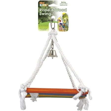 The Penn-Plax Rope and Wood Platform Swing Bird Toy with Bell toy will make a great addition to your bird’s cage. This fun swinging platform toy provides a safe outlet for your bird’s natural climbing and playing needs, keeping them busy and engaged from morning ’till night. Birds will develop excellent climbing skills as they try to master the swinging toy. It also provides a nice spot for them to rest and relax. Comes with universal safety-clips for easy installation in any wired bird cage! The platform measures 5.25 inches deep by 7.75 inches wide. It is great for many breeds of birds including parakeets, conures, lovebirds, budgies, cockatoos, cockatiels, small parrots, finches, parrotlets, canaries, and other small to medium-sized domesticated pets.