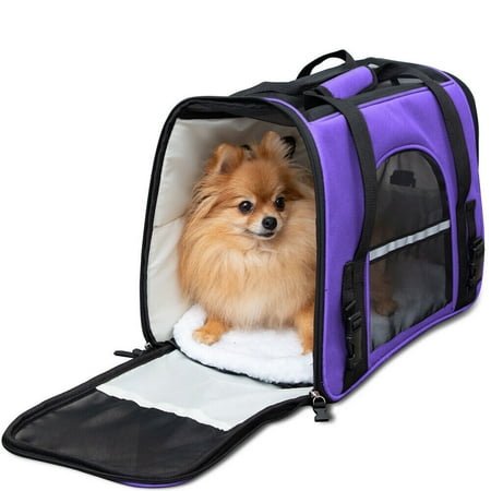 Pet Dog Cat Carrier Bag Soft Sided Comfort Travel Tote Case Small Size Purple Color Product Description: This Pet Carrier bag Help your pet travel in style with a soft-sided pet carrier. Designed to keep small dogs and cats safe during long plane flights, this airline-approved carrier is lightweight and easy to carry. It has meshed sides to keep your furry friend cool during the flight. A fleece-lined bottom makes for a comfortable bed during the flight. Specification: Type: Airline Carrier Material: Nylon Color: Purple Size: Small(Can hold up to 7 pounds) Dimension: (S)17x8x11.5 inches. Features: Comfort for your pet : Made from durable and comfortable breathable materials for maximum airflow. Your pet will stay comfortable while you travel. Ventilated security screens are easy to clean and washable Ready to fly : Compliant with most airlines (please check with your airline before flying). The unwind and bind feature allows owners access to their pets without the risk of escape. Sleep well : With the fleece bed, your pet will enjoy a nice slumber regardless of the locale. It’s comfortable and supportive, making it a terrific bed to ease joint pain and relieve pressure points. It’s perfect for flying, road trips, or even just walking around town. Package included: 1 X Pet Carrier
