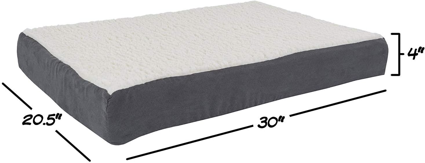 PRODUCT DETAILS – Materials: Sherpa, Microsuede, Polyurethane Foam, and Memory Foam. Dimensions: (L) 30″ x (W) 20.5″ x (H) 4″. Supports Dogs Weighing Between 20 and 45lbs. Works on Floors, in Cars, and as Dog Crate Bed. Color: Gray.