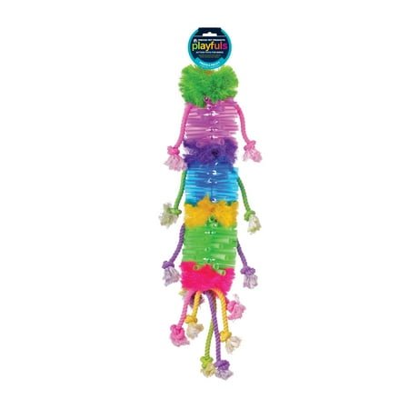 Prevue Pet Products Playful Caterpillar 62665 provides your bird with plenty of ways to satisfy plucking and preening urges. Easily connected to your bird cage with quick-link attachments and made from 100% safe non-toxic materials and FD&C colors, Calypso Creations bird toys may contain a combination of knotted rope, plastic beads, crinkly paper, wooden circles and woven natural palm leaves. Our Calypso Creations Caterpillar toy is 27’’ Long and 7’’ Wide, ideal for Medium and Large birds.