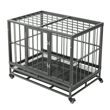 Introductions: This is our brand new heavy duty strong dog cage with wheel. This cage is designed in particular with a heavy duty steel frame, a perfect choice for you to keep your pets safe and comfortable. Each bar is firmly welded to ensure the strongest sturdy construction. Double-door design with one in front and the other on top allow easy access to our pet. You can change food and water for your pet from the front door. When you want to take your pet out from the cage, the door on the top will work. The front door has double latches and top door with one, which are quite strong to protect our pet from escaping. Grate design floor allows dirties to drop down to the below tray, keep a clean environment for pets. Both of the grate floor and steel tray can be easily slide out from the bottom for easy and convenient cleaning. Besides, the cage is equipped with four rolling casters for easy moving and two of them are lockable design to avoid accidental moving. Features: 1. High quality and brand new 2. Heavy duty steel frame, strong and durable 3. Equipped with four casters for easy moving and two of them are lockable to avoid accidental move 4. The grate floor and steel tray on the bottom can be slide out for easy cleaning 5. Double door design with one on top and the other in front allow for easy access 6. Front Door with two latches for easy access 7. These pet homes are constructed using a 3/4″ frame and 1/2″ diameter tubes made of top quality steel 8. Folds down easily, take it anywhere 9. Easy to assemble Specifications: 1. Material: Iron 2. Color: Silver 3. Applicable Pets: Small or Medium Dog like American Eskimo, Bull Terrier, Springer Spaniel,Norvegian Elkhound,Australian Cattle Dog,Bulldog,Finnish Spitez, cat,rabbit and so on 4. Size: 36.5″ / 92.5cm 5. Dimensions: (36.5 x 24.4 x 30.1)” / (92.5 x 62 x 76.5)cm (L x W x H) 6. Weight: 17.5kg / 38.6lbs 7. Door Dimensions: (13.20 x 20.07)” / (33.5 x 51)cm (L x H) Package Includes: 1 x Cage 1 x Instruction